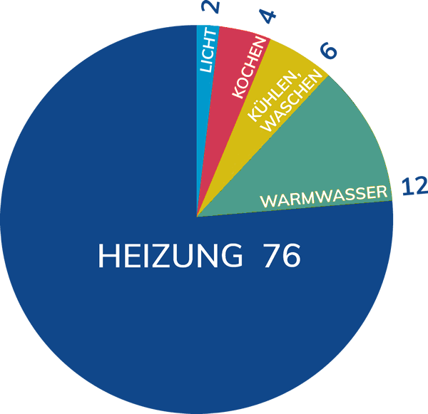 Der Stromverbrauch im Haushalt beträgt 12 % der Gesamtenergiemenge. Davon wird bis heute nur ein kleiner Teil ca. 4 % regenativ erzeugt. Heizung und Warmwasser verbrauchen den Rest von 88%.