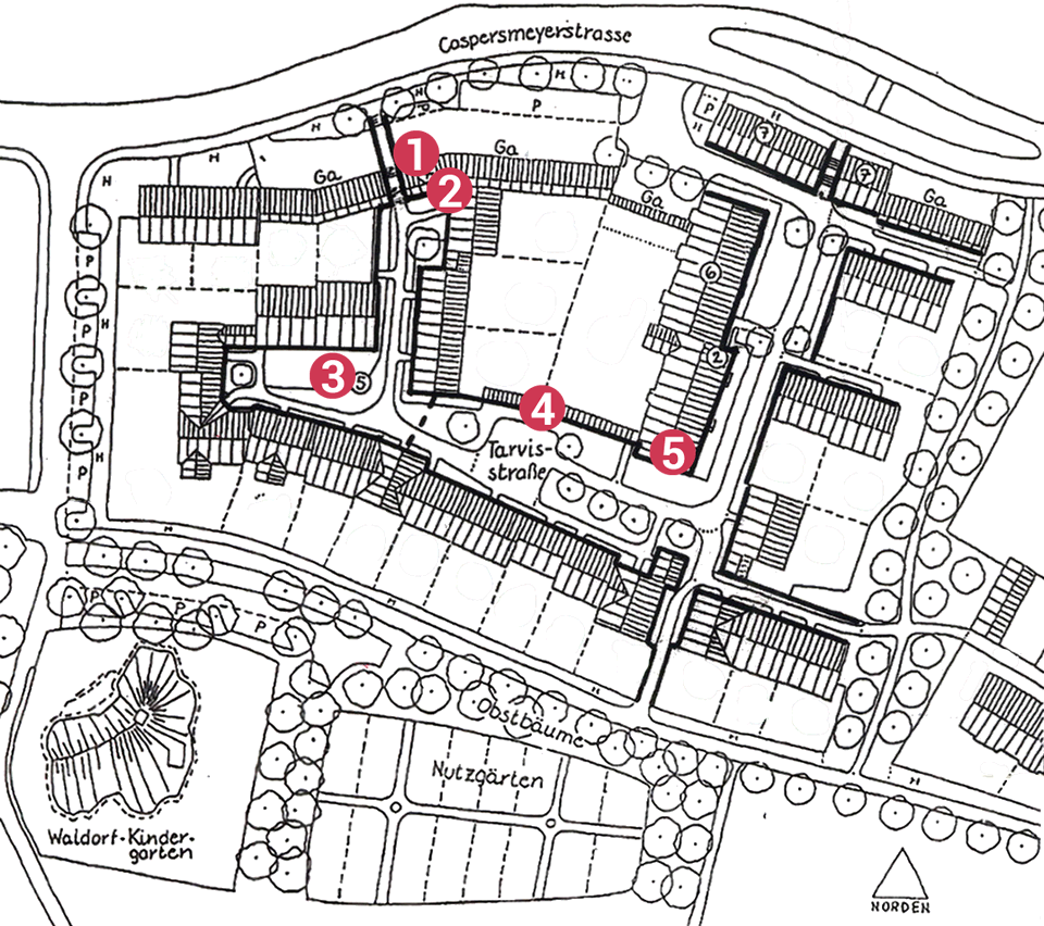 8. Gemeinschaftseinrichtungen 1 = Tischtennisraum (oben),2 = Müllsammelraum (unten),3 = Wasserspielplatz, 4 = Arkaden,5 = Gemeinschaftsraum (gemietet) Im Gemeinschaftsraum Arkaden und Gemeinschaftsraum Großer Anger