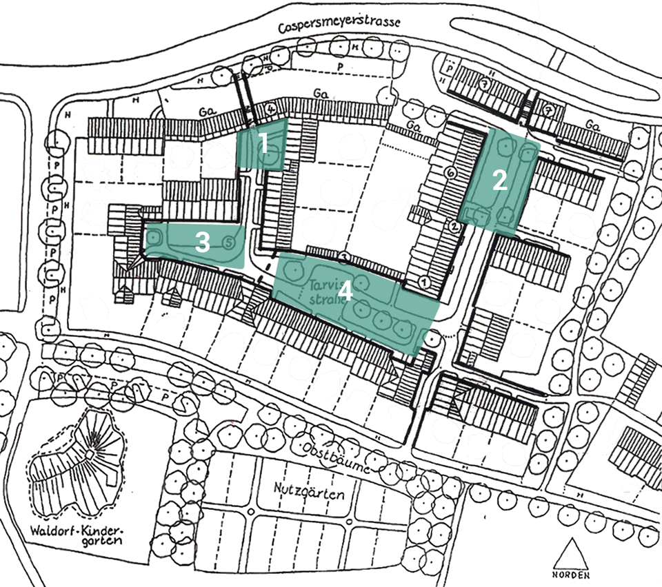 Die vier Plätze werden durch Gassen verbunden. Das ist der Kern der Siedlungsplanung.